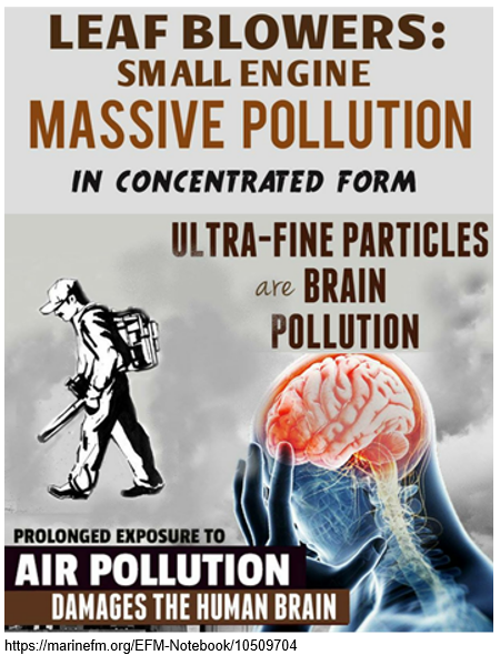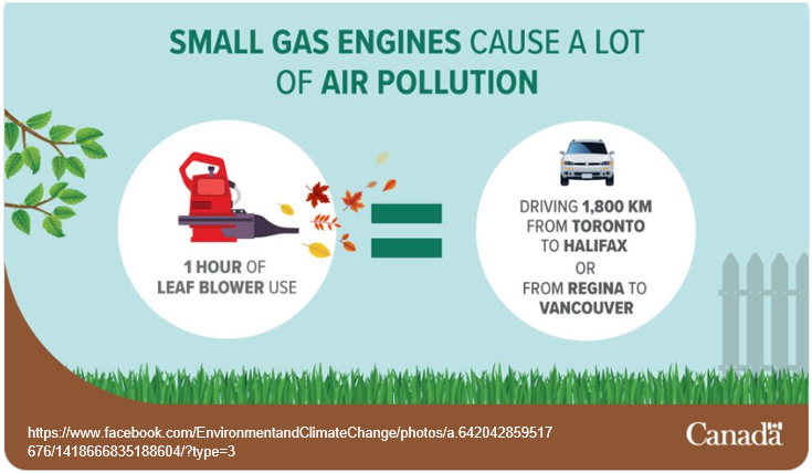 Gas-powered lawn mowers, snow blowers, and leaf blowers are also a significant source of pollution, as they don’t have filters to capture many of the pollutants, and those with two-stroke engines burn an oil/gas mixture that is more polluting than burning gas alone. One hour of leaf blower use can result in the amount of pollution produced by driving 1,800 km