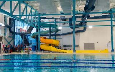 The water slide is a fun, family-friendly feature designed for safe and splash-filled excitement. The slide twists down into a dedicated trough rather than the main pool, allowing swimmers of all ages to enjoy the ride comfortably. Renovated in 2020, you could be the first to name this feature!