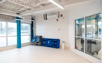 This extra space at the Aquatics Centre is used during special events and as an extra room for birthday parties and other rentals. Kin Room 2 is also used by the football teams as a change space for practices and games at the nearby fields.