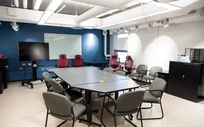 Meeting Room 1204 is a multipurpose room that is bright and welcoming equipped with flexible seating arrangements suitable for a variety of meetings and uses. It can host up to 75 people with presentation equipment and a kitchenette space for refreshments.