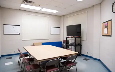 This room is located by the lobby of the Mayer Aquatic Centre and is set up as a classroom for up to 8 people. It is used to host courses for Aquatic Centre staff and rented for courses by external groups.