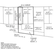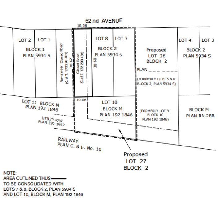 PURPOSE: The purpose of the subdivision is to subdivide and consolidate a portion of closed portion of roadway along 52 Avenue. The east portion of the closed road will be consolidated with the property located directly east of that section.
