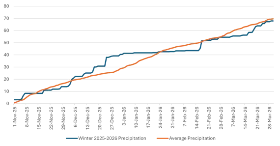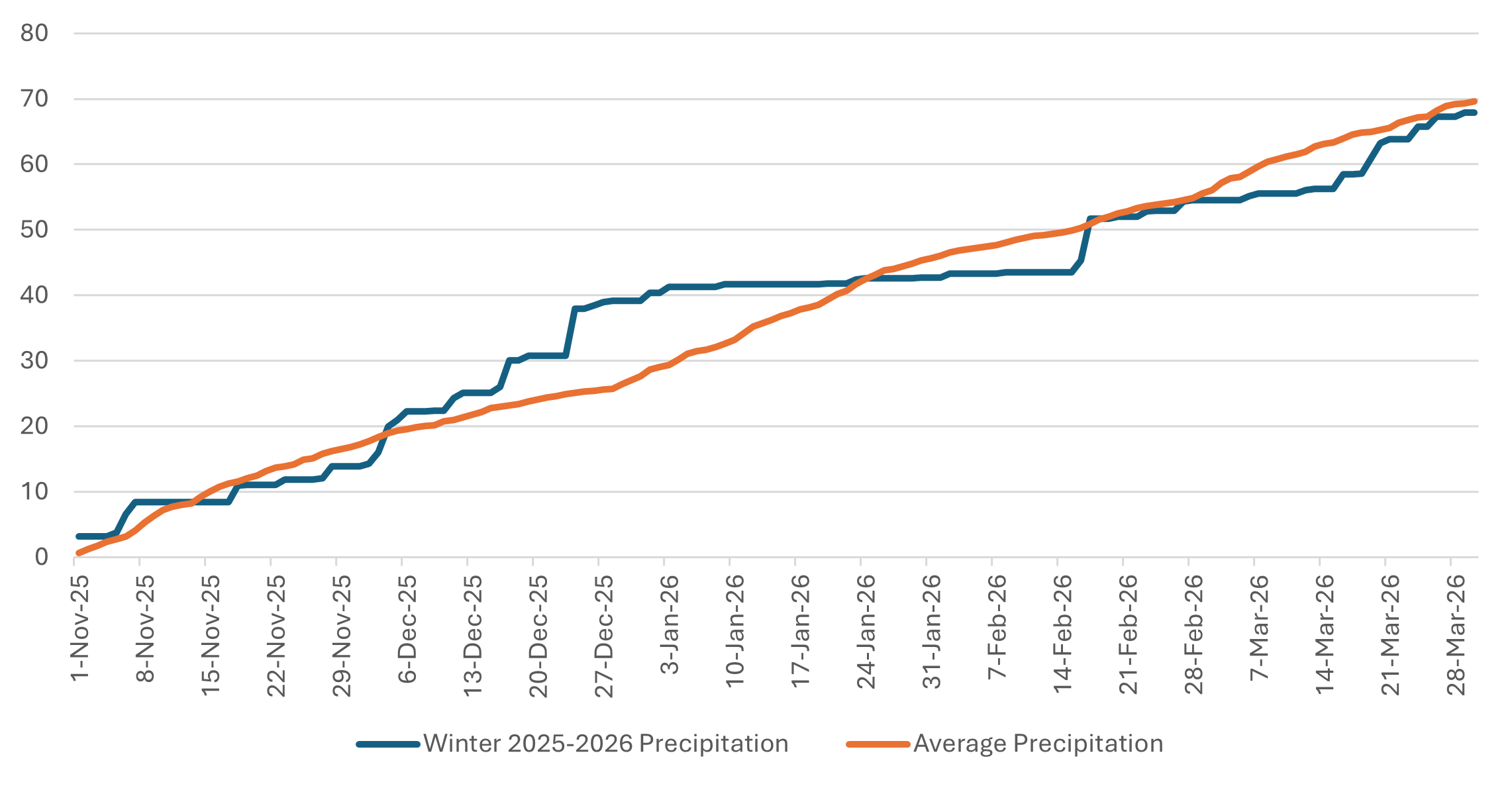 Conditions over the fall and winter have remained dry, with limited snowpack heading into spring. While the city received approximately 67 mm of precipitation this winter, the total amount received was slightly less than an average year for the Camrose region (69mm) based on rainfall records since 1991. Also, with the dry fall that the city experienced in 2025, the precipitation received was not enough to make up for several years of dry weather, as much of the moisture is expected to soak into the ground rather than run off into Dried Meat Lake.