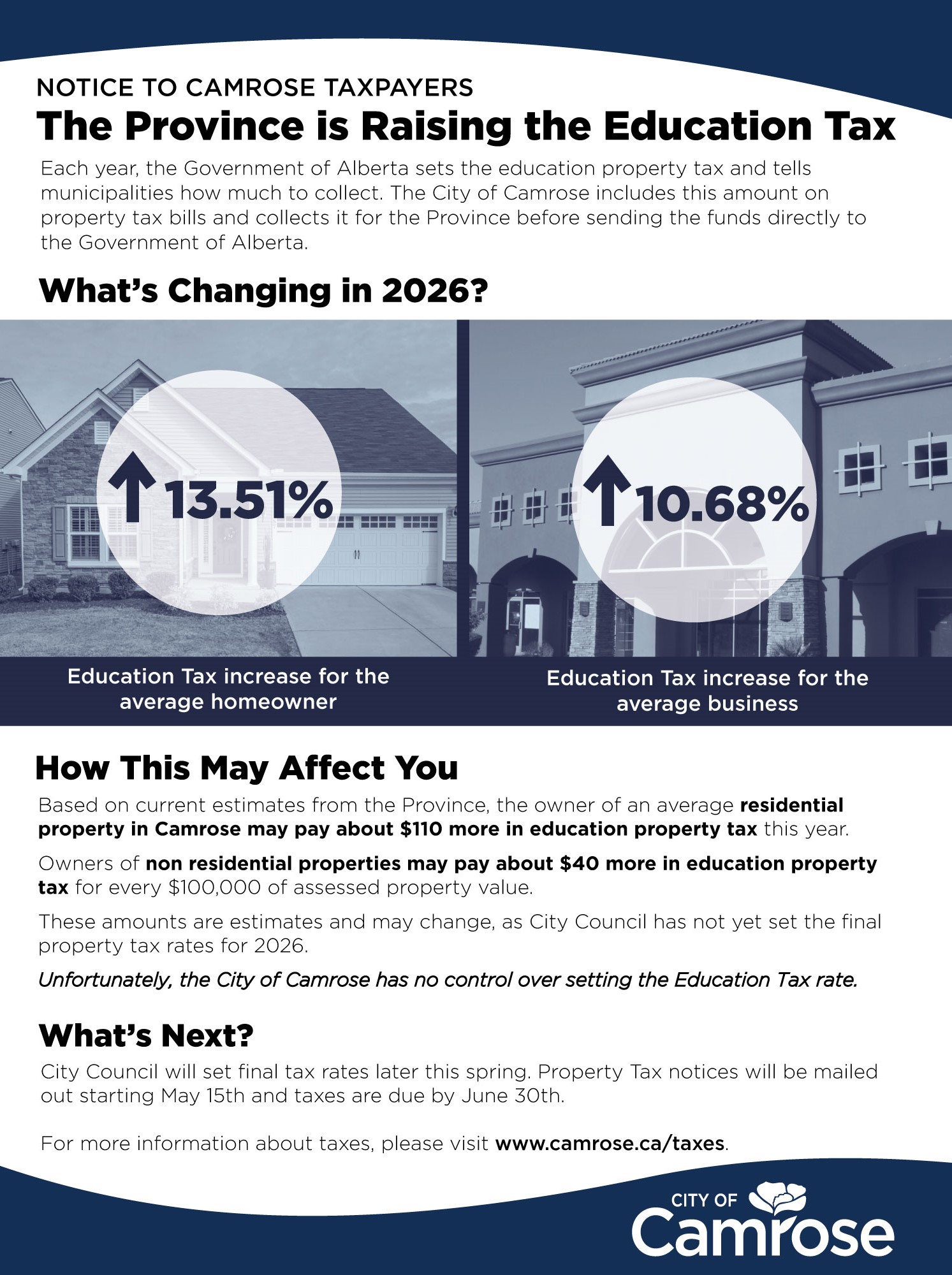 The City of Camrose is currently finalizing the 2026 municipal property tax rates. The exact impact on individual properties will not be confirmed until property tax notices are issued in May, and more information will be shared with residents at that time.
