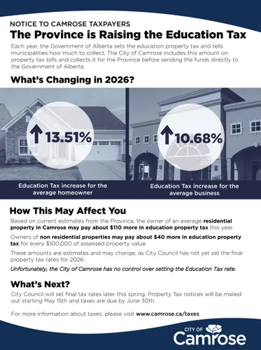 This year, residents will see a larger increase on their property tax bill than usual. A significant portion of that increase is due to the provincial education property tax set by the Province of Alberta. While the City of Camrose collects this tax on the property tax notice, the City does not set this amount and must send the funds directly to the Province.